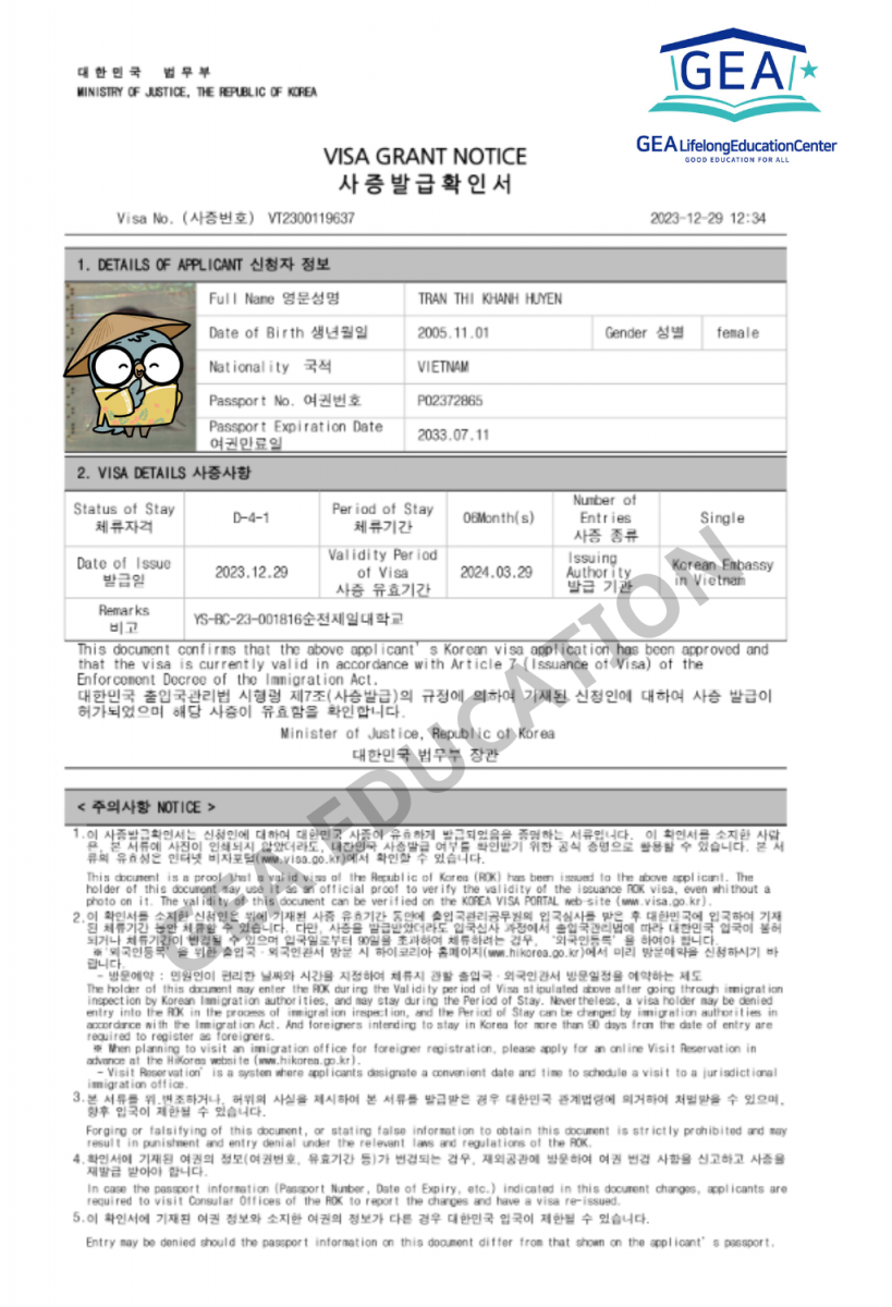 • Khi nhập cảnh Hàn Quốc, bạn cần làm thẻ người nước ngoài và visa sẽ có hiệu lực 6 tháng đối với chương trình D4-1.